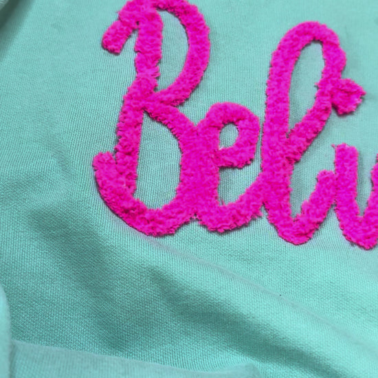 - Design: “Believe” in hot pink hand-sewn chenille yarn