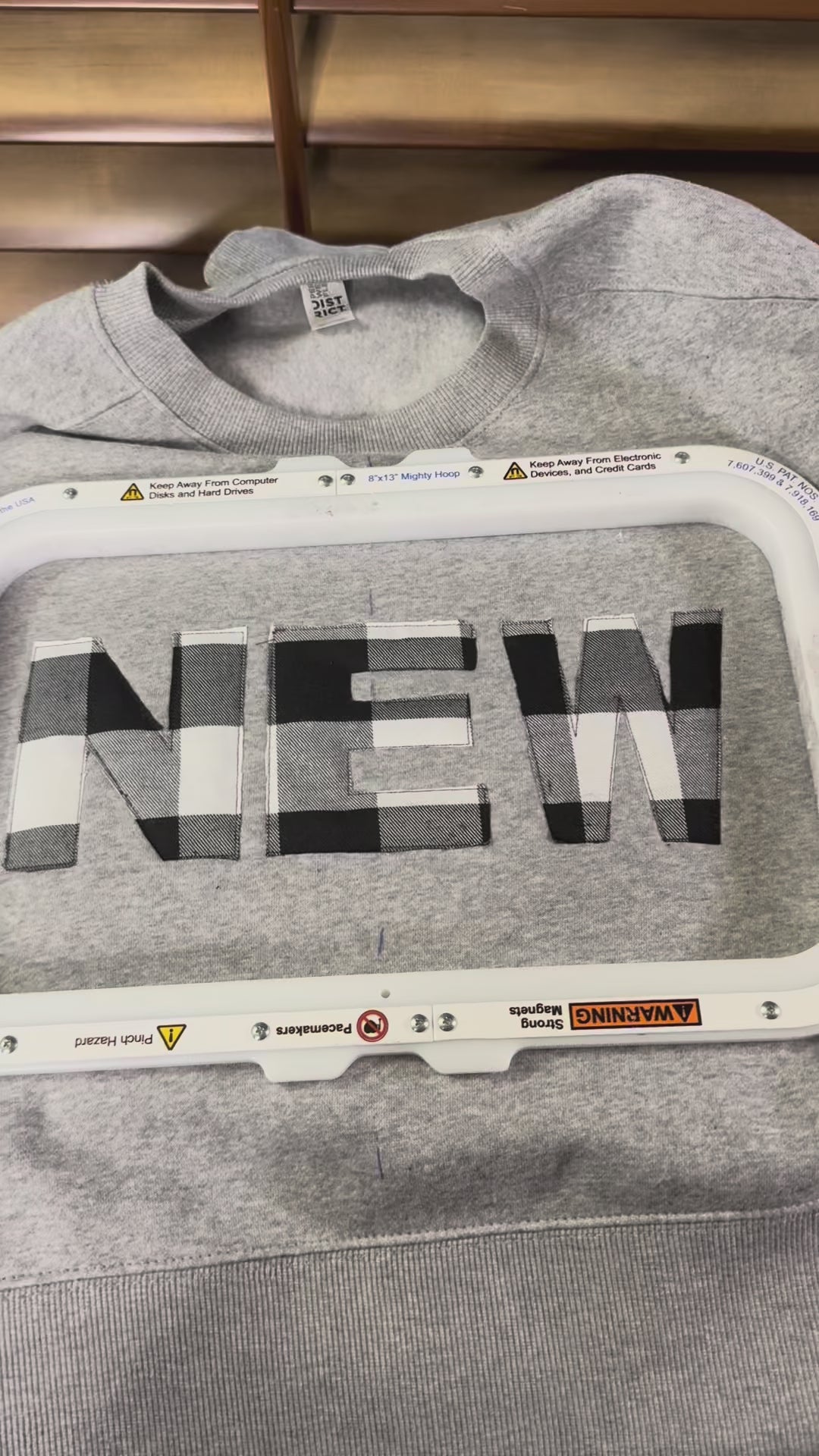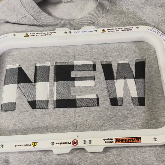 - Bold buffalo-check “NEW” lettering