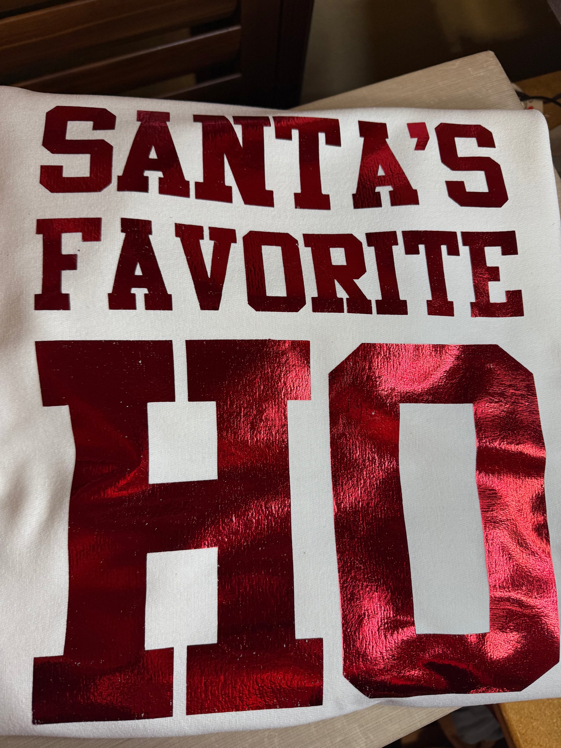 - Design: “Santa’s Favorite Ho” in shimmering red metallic foil, also available in Gold and green foil