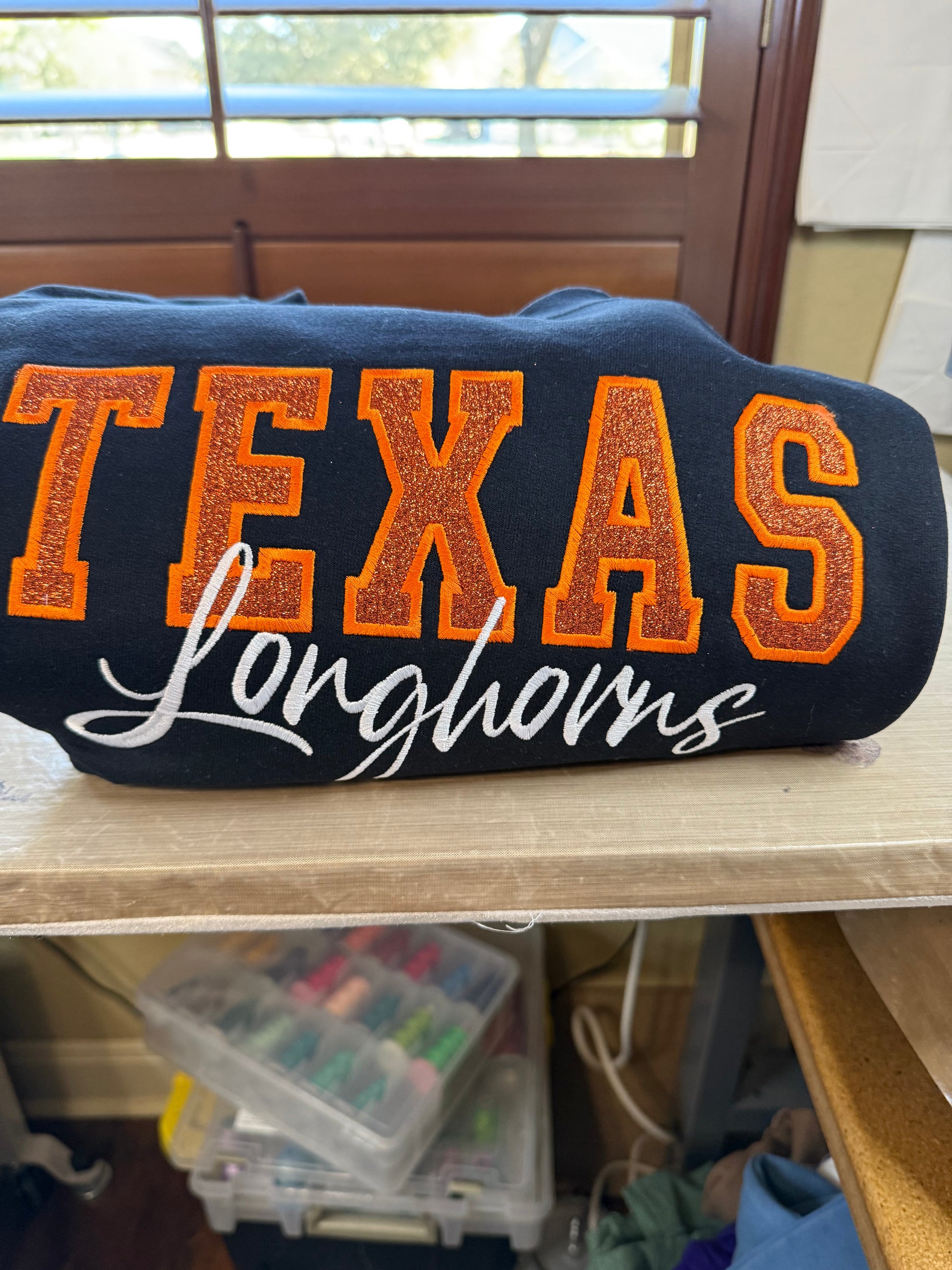Bring the sparkle to game day! This custom Texas Longhorn sweatshirt features a bold glitter appliqué that shines from kickoff to post-game. Perfect for tailgates, chilly stadium nights, and showing off your burnt-orange pride in style.